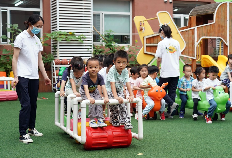 7月4日,在中國科學院第三幼兒園,小朋友們在戶外玩耍。