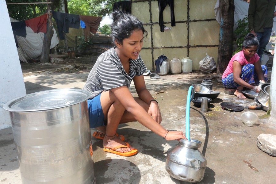 6月22日,女孩在印度中央邦博帕爾戈拉村通過水管打水。