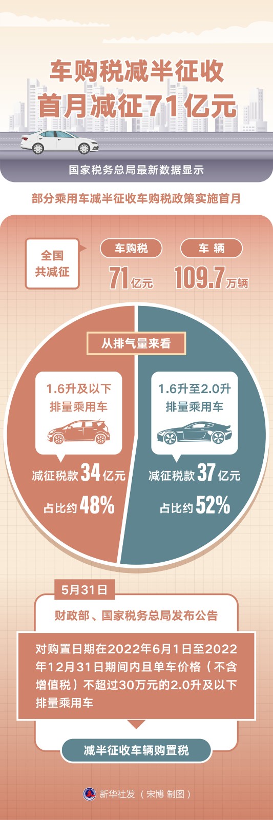 自6月1日起實(shí)施的部分乘用車減半征收車購(gòu)稅政策已經(jīng)“滿月”。國(guó)家稅務(wù)總局最新數(shù)據(jù)顯示,政策實(shí)施首月,全國(guó)共減征車購(gòu)稅71億元,減征車輛109.7萬輛。從排氣量來看,1.6升及以下排量乘用車減征稅款34億元,占比約48%;1.6升至2.0升排量乘用車減征稅款37億元,占比約52%。