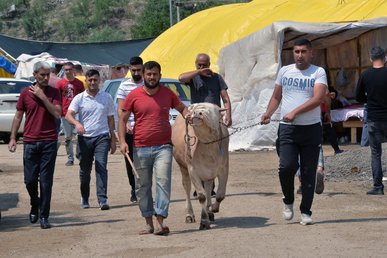 7月9日,人們牽著牛走過土耳其安卡拉一處牲畜市場。