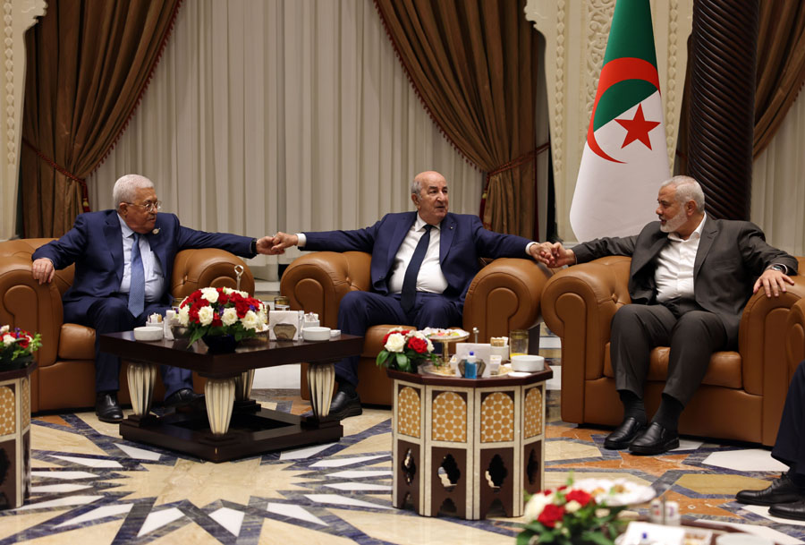 7月5日,在阿爾及利亞阿爾及爾,巴勒斯坦總統(tǒng)、巴民族解放運(yùn)動(法塔赫)主席阿巴斯(左)與巴伊斯蘭抵抗運(yùn)動(哈馬斯)政治局領(lǐng)導(dǎo)人伊斯梅爾·哈尼亞(右)出席由阿爾及利亞總統(tǒng)特本(中)促成的會晤。