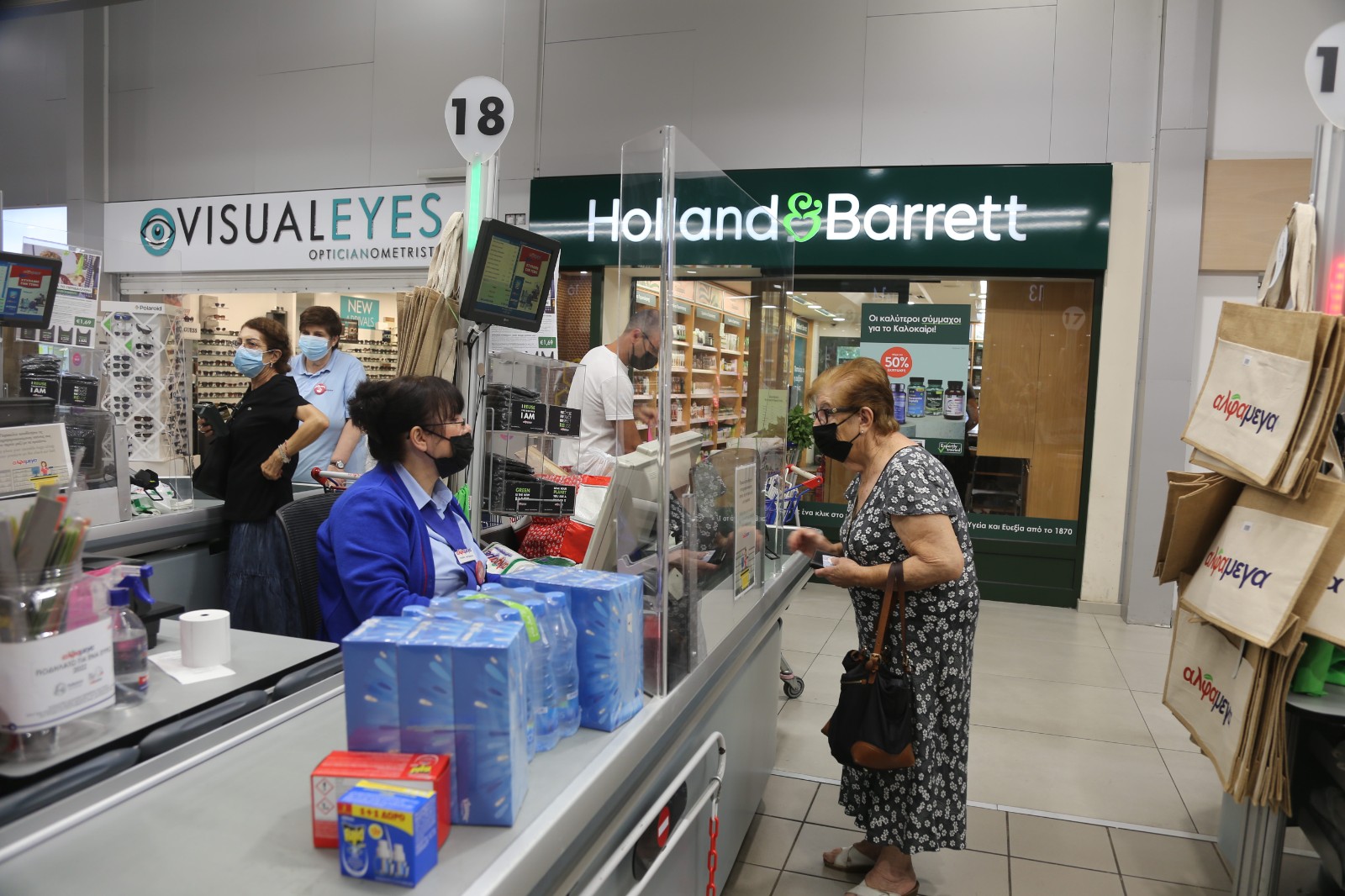 7月8日,人們佩戴口罩在塞浦路斯首都尼科西亞一家超市購(gòu)物。