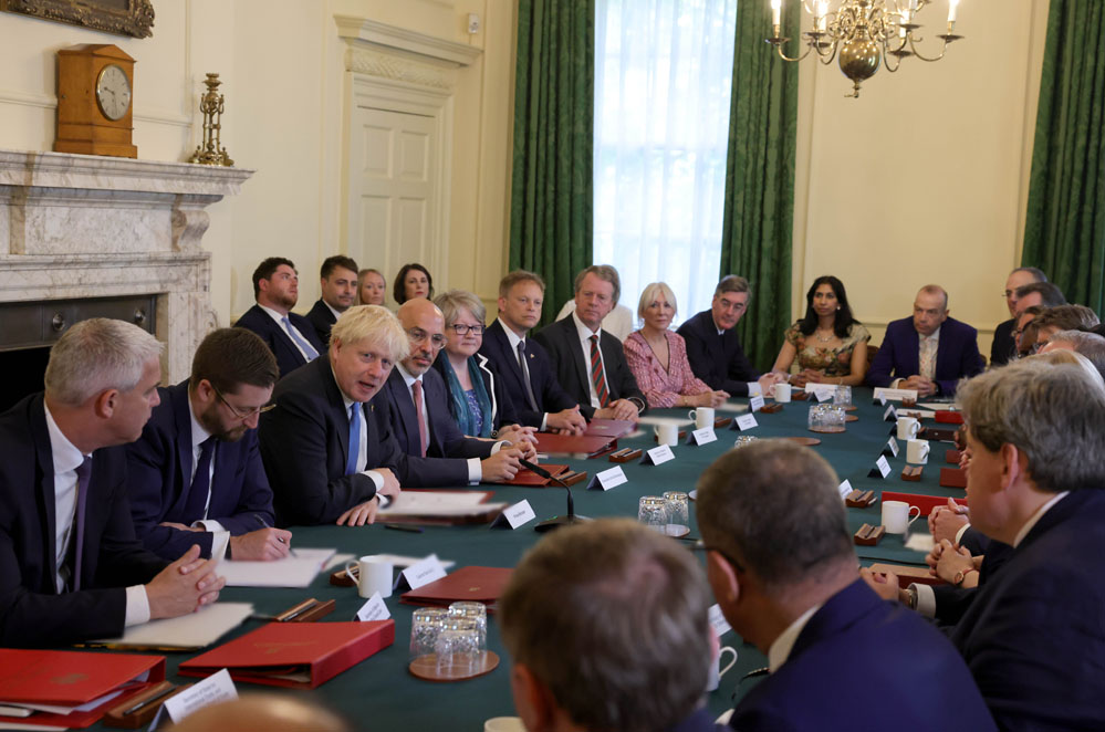 7月19日,約翰遜(前左三)在英國倫敦首相府主持他卸任前最后一次內(nèi)閣會議。