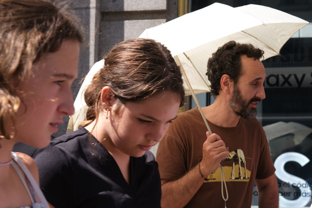 7月20日,一名男子撐傘走在西班牙馬德里街頭。