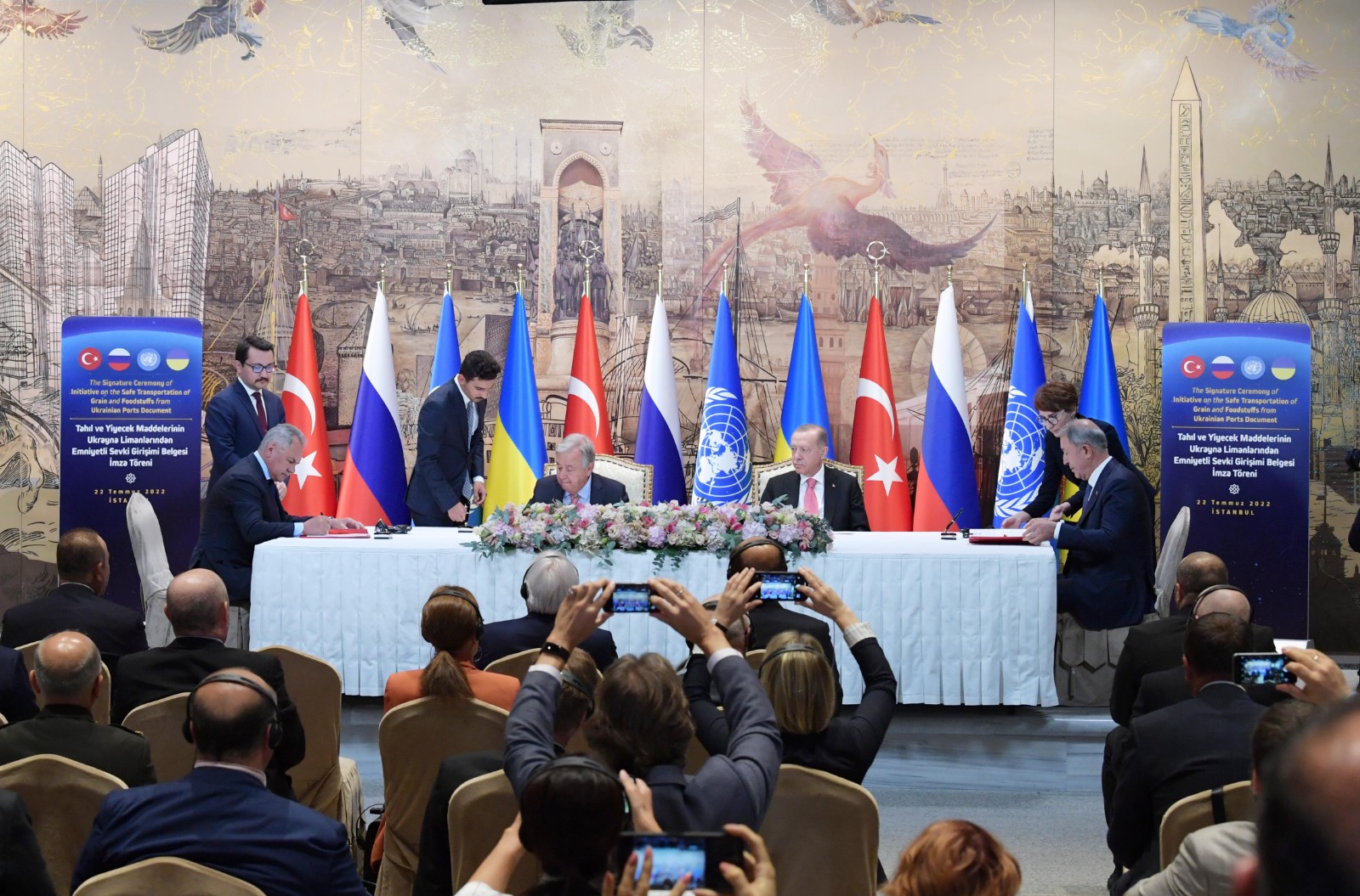 當(dāng)日,土耳其、俄羅斯、烏克蘭和聯(lián)合國代表在土耳其最大城市伊斯坦布爾就從黑海港口外運(yùn)農(nóng)產(chǎn)品問題舉行簽署協(xié)議儀式。