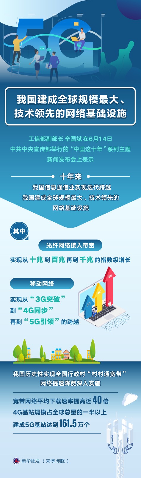 工信部副部長(zhǎng)辛國(guó)斌在6月14日中共中央宣傳部舉行的“中國(guó)這十年”系列主題新聞發(fā)布會(huì)上表示,十年來(lái),我國(guó)信息通信業(yè)實(shí)現(xiàn)迭代跨越,建成全球規(guī)模最大、技術(shù)領(lǐng)先的網(wǎng)絡(luò)基礎(chǔ)設(shè)施。其中,光纖網(wǎng)絡(luò)接入帶寬實(shí)現(xiàn)從十兆到百兆再到千兆的指數(shù)級(jí)增長(zhǎng),移動(dòng)網(wǎng)絡(luò)實(shí)現(xiàn)從“3G突破”到“4G同步”再到“5G引領(lǐng)”的跨越。