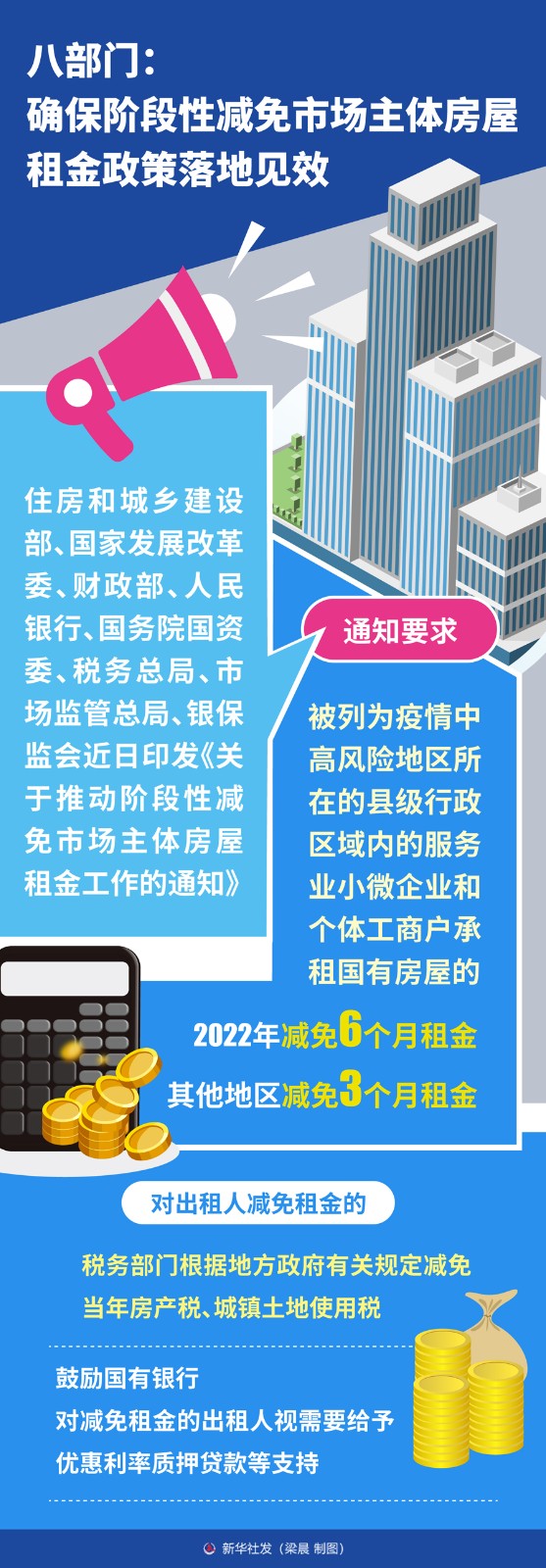 住房和城鄉(xiāng)建設(shè)部、國家發(fā)展改革委、財政部、人民銀行、國務(wù)院國資委、稅務(wù)總局、市場監(jiān)管總局、銀保監(jiān)會近日印發(fā)《關(guān)于推動階段性減免市場主體房屋租金工作的通知》,要求各地結(jié)合自身實際,統(tǒng)籌各類資金,拿出務(wù)實管用措施推動減免市場主體房屋租金,確保各項政策措施落地生效。