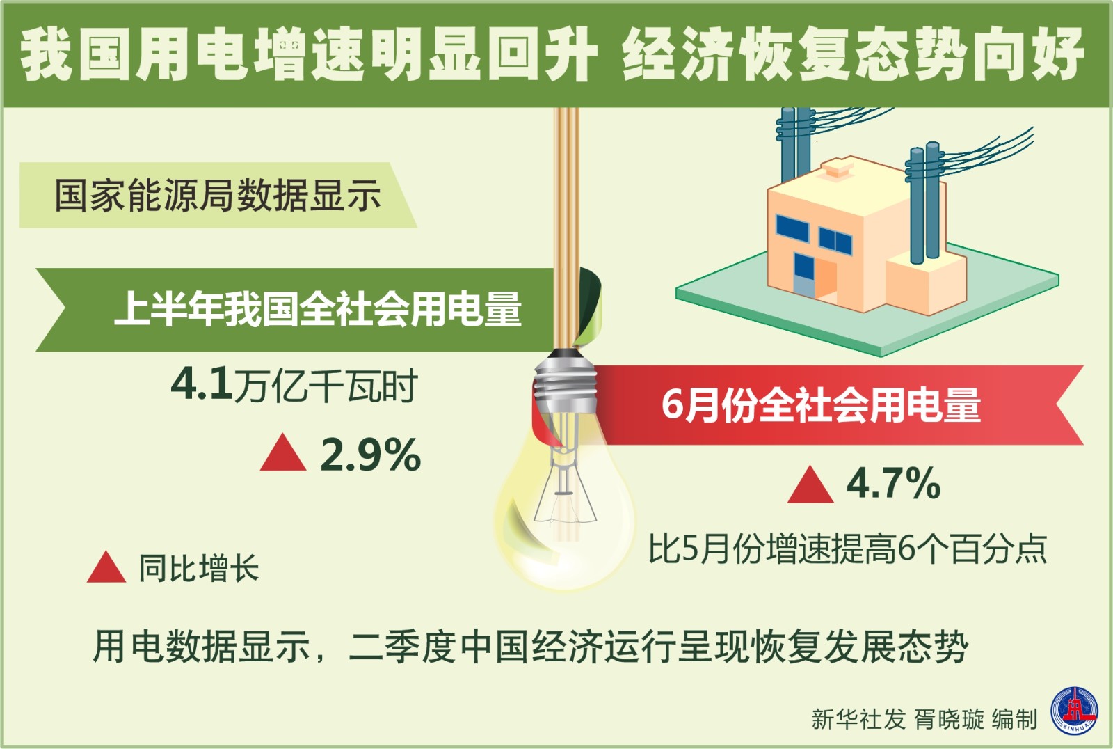 國家能源局?jǐn)?shù)據(jù)顯示,上半年我國全社會用電量4.1萬億千瓦時,同比增長2.9%。6月份全社會用電量同比增長4.7%,比5月份增速提高6個百分點。用電數(shù)據(jù)顯示,二季度中國經(jīng)濟運行呈現(xiàn)恢復(fù)發(fā)展態(tài)勢。
