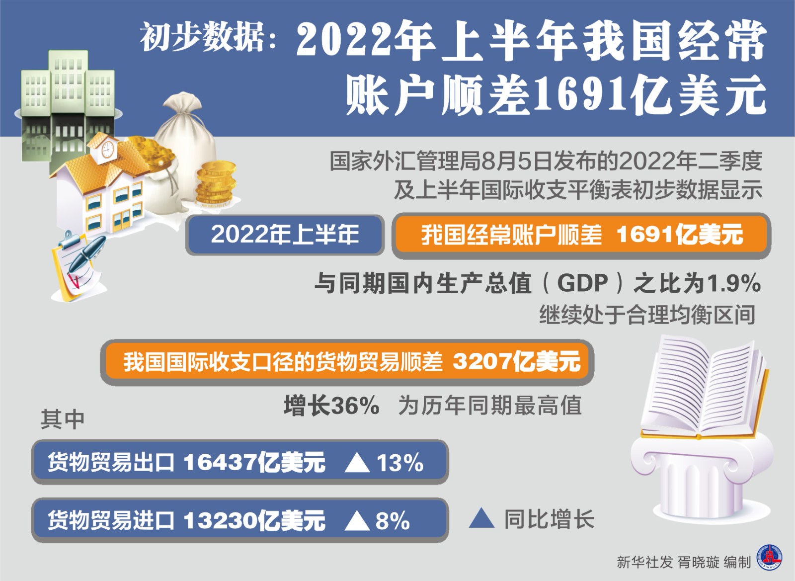 國家外匯管理局8月5日發(fā)布的2022年二季度及上半年國際收支平衡表初步數(shù)據(jù)顯示,2022年上半年,我國經(jīng)常賬戶順差1691億美元,與同期國內生產(chǎn)總值(GDP)之比為1.9%,繼續(xù)處于合理均衡區(qū)間。