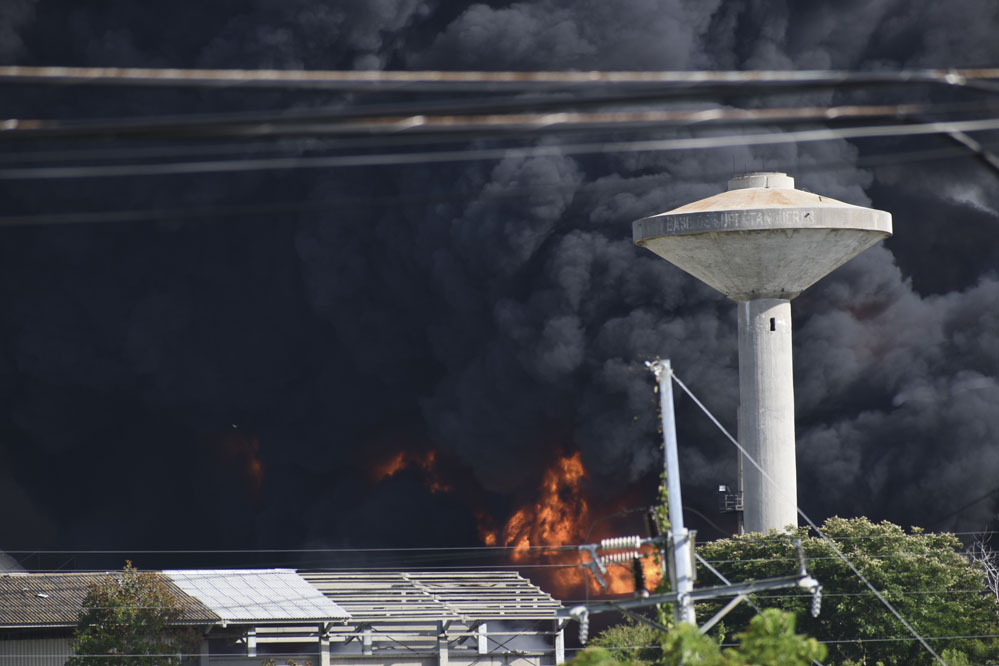 8月7日,古巴馬坦薩斯省火災(zāi)現(xiàn)場(chǎng)的儲(chǔ)油罐繼續(xù)燃燒并冒出濃煙。