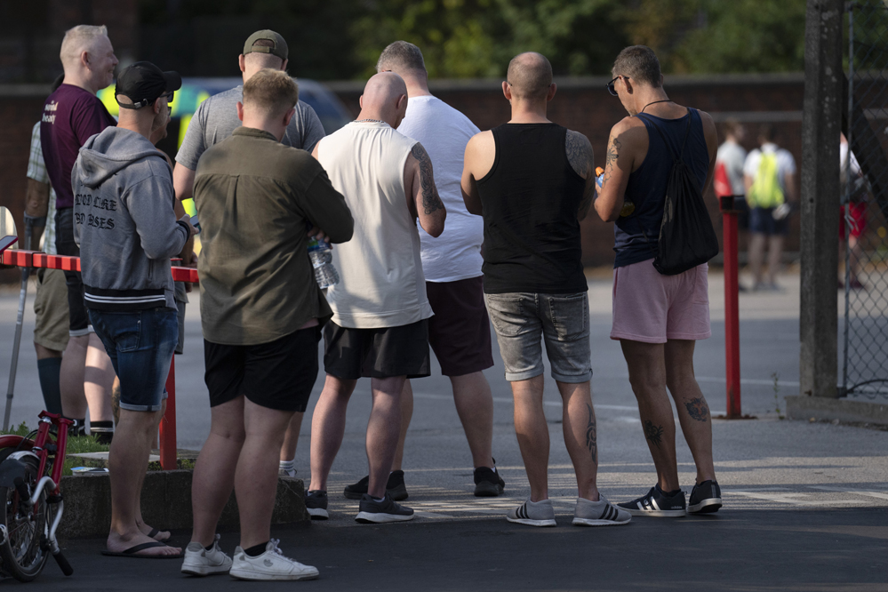 8月14日,人們在英國曼徹斯特一處猴痘疫苗接種點外排隊等待接種疫苗。