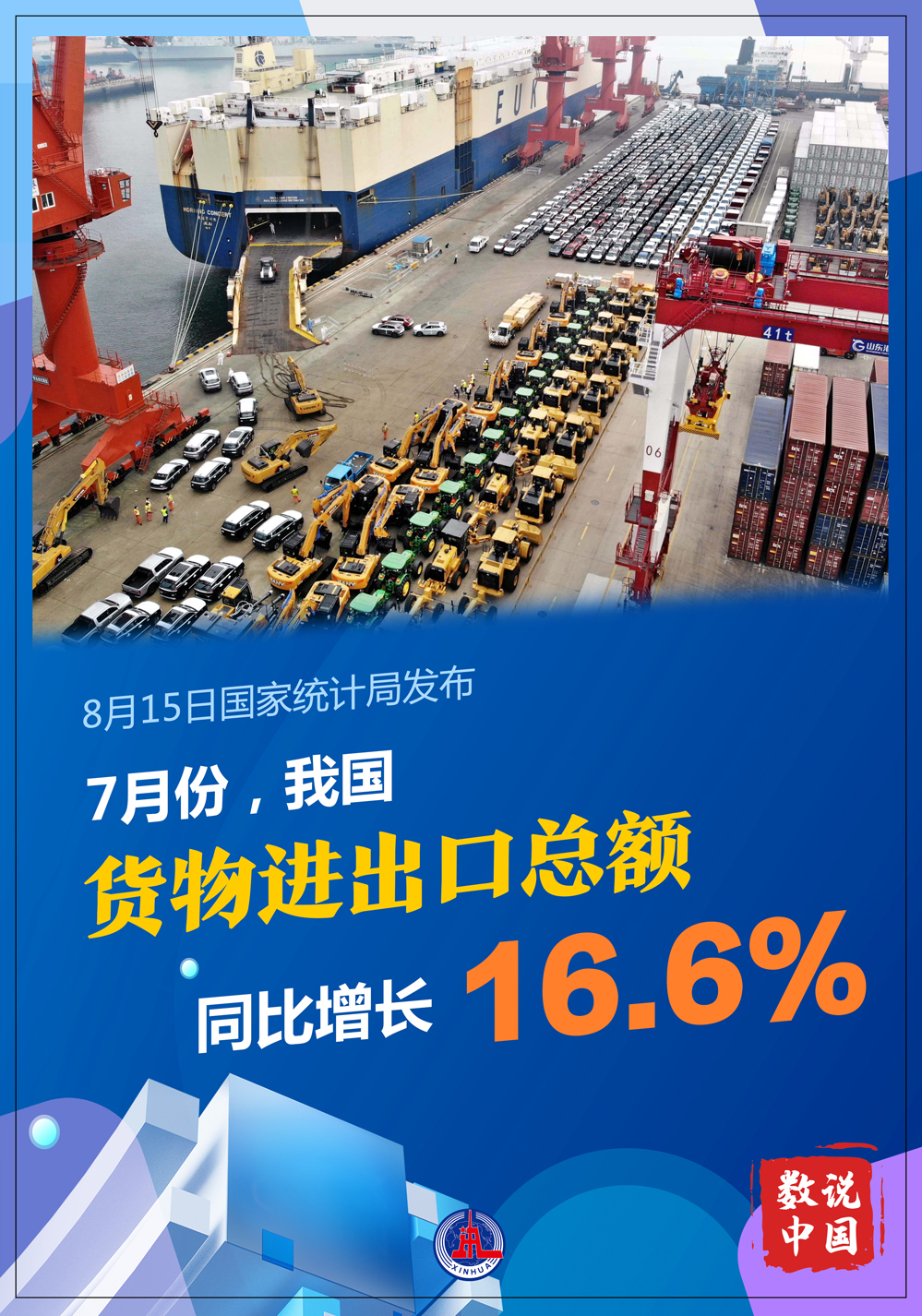 國家統(tǒng)計局8月15日發(fā)布數(shù)據(jù)顯示,7月份,貨物進出口總額同比增長16.6%,比上月加快2.3個百分點。