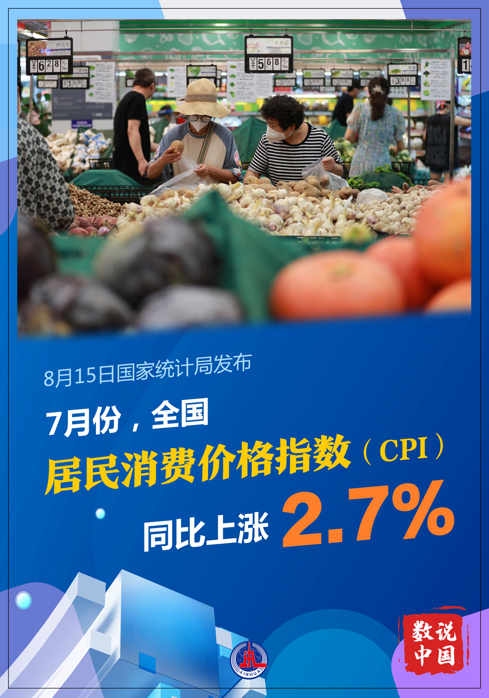 國家統(tǒng)計局8月15日發(fā)布數(shù)據(jù)顯示,7月份,全國居民消費(fèi)價格指數(shù)(CPI)同比上漲2.7%,漲幅比上月擴(kuò)大0.2個百分點(diǎn)。