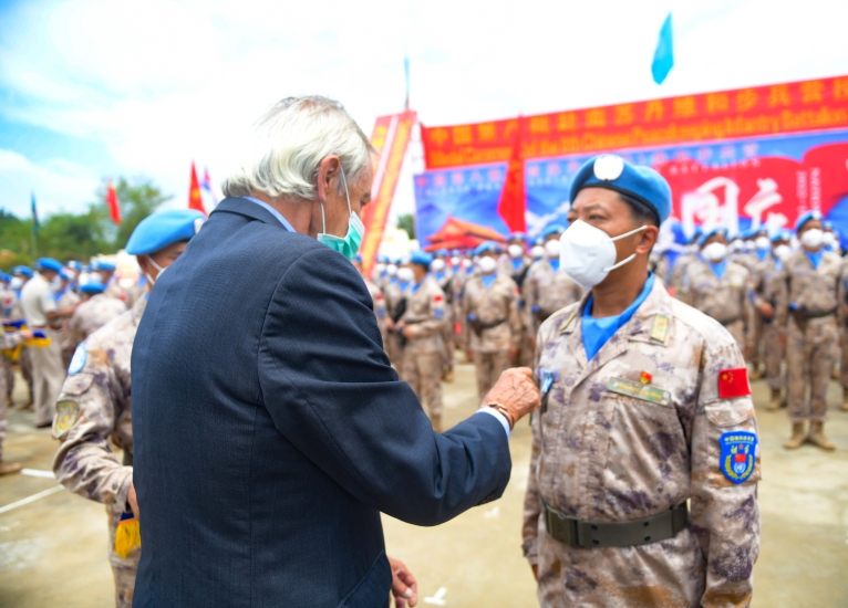 9月30日,在聯(lián)合國駐南蘇丹特派團(tuán)超級營地,聯(lián)合國秘書長特別代表兼聯(lián)南蘇團(tuán)團(tuán)長尼古拉斯·海瑟姆為中國維和官兵授勛。