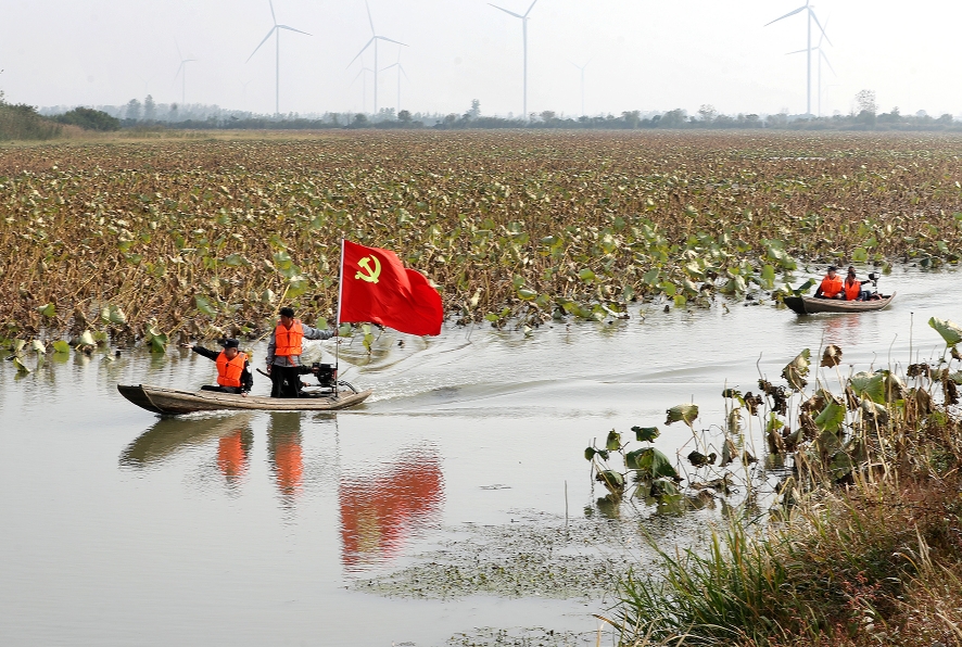 10月31日,在湖北省沙洋縣借糧湖水域,沙洋縣公安局毛李水陸派出所河湖警長與村干部開展生態(tài)保護例行巡查。今年以來,沙洋縣公安局推進河湖警長工作機制,在漢江、長湖等江河湖泊開展生態(tài)環(huán)境保護巡查,嚴厲打擊污染環(huán)境、非法捕撈、非法采砂等違法犯罪,為保護生態(tài)環(huán)境筑牢法治屏障。