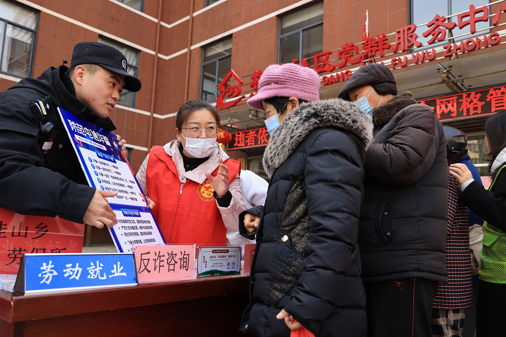 圖為民警與志愿者向現(xiàn)場群眾開展普法、反詐宣傳。