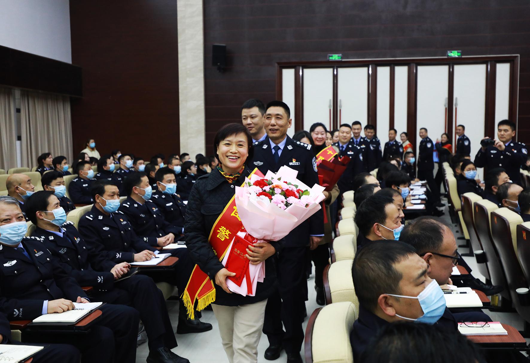 2月8日,在湖北省秭歸縣公安局表彰優(yōu)秀警嫂的現(xiàn)場,10名民警突然上演了一場”早有預(yù)謀”的浪漫演出,為當(dāng)選優(yōu)秀警嫂的妻子送上充滿愛意與感激的鮮花,一起并肩走上領(lǐng)獎臺。