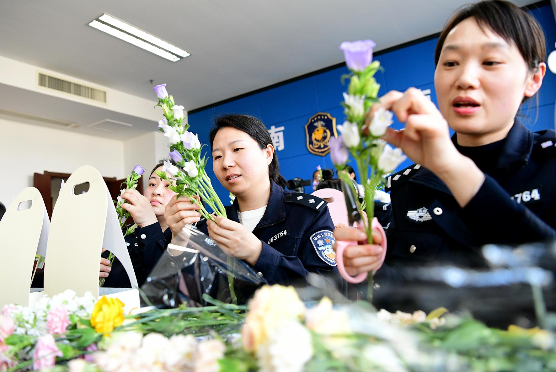 3月7日,安徽省阜南縣公安局女民輔警在花藝老師的指導下插花。為慶?!叭恕眹H婦女節(jié),阜南縣公安局舉辦“學花藝 慶節(jié)日”活動。