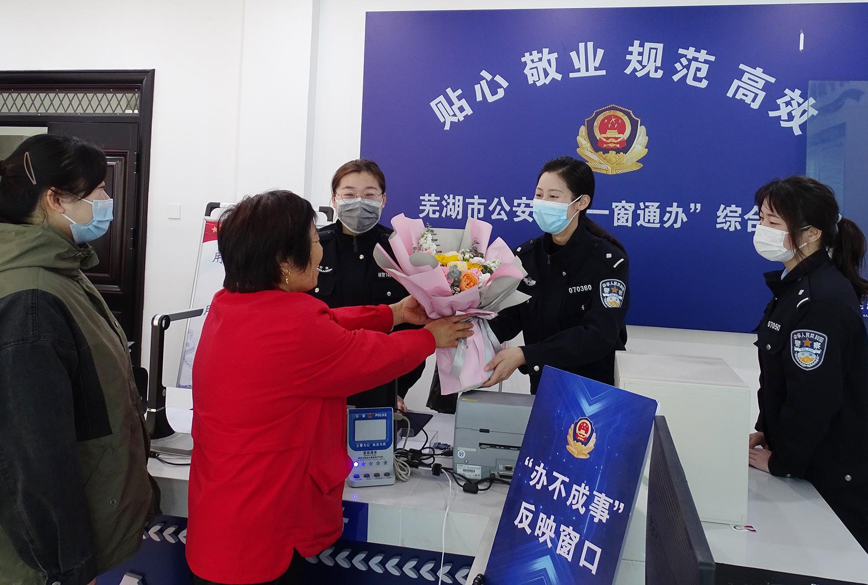 “你們辛苦啦!”3月8日,安徽省蕪湖市公安局鏡湖分局赭麓派出所戶籍室,群眾將鮮花獻給女民警、女輔警,向奮戰(zhàn)在一線的她們致以節(jié)日的問候。