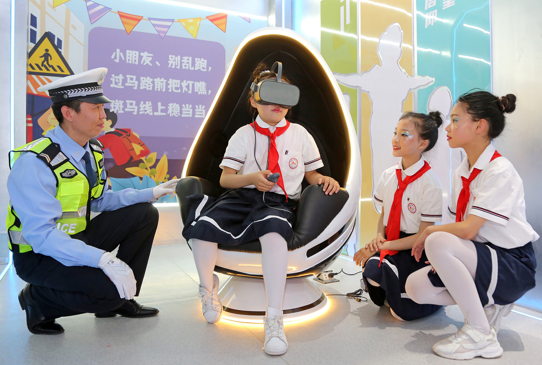 5月30日,陜西省渭南市高新區(qū)紅旗駕校交通安全教育基地兒童VR交通安全模擬體驗(yàn)區(qū),小學(xué)生在沉浸式體驗(yàn)道路交通安全。當(dāng)日,渭南市公安局交警支隊(duì)高新大隊(duì)開展“知危險(xiǎn) 會(huì)避險(xiǎn)”交通安全主題宣傳活動(dòng)。