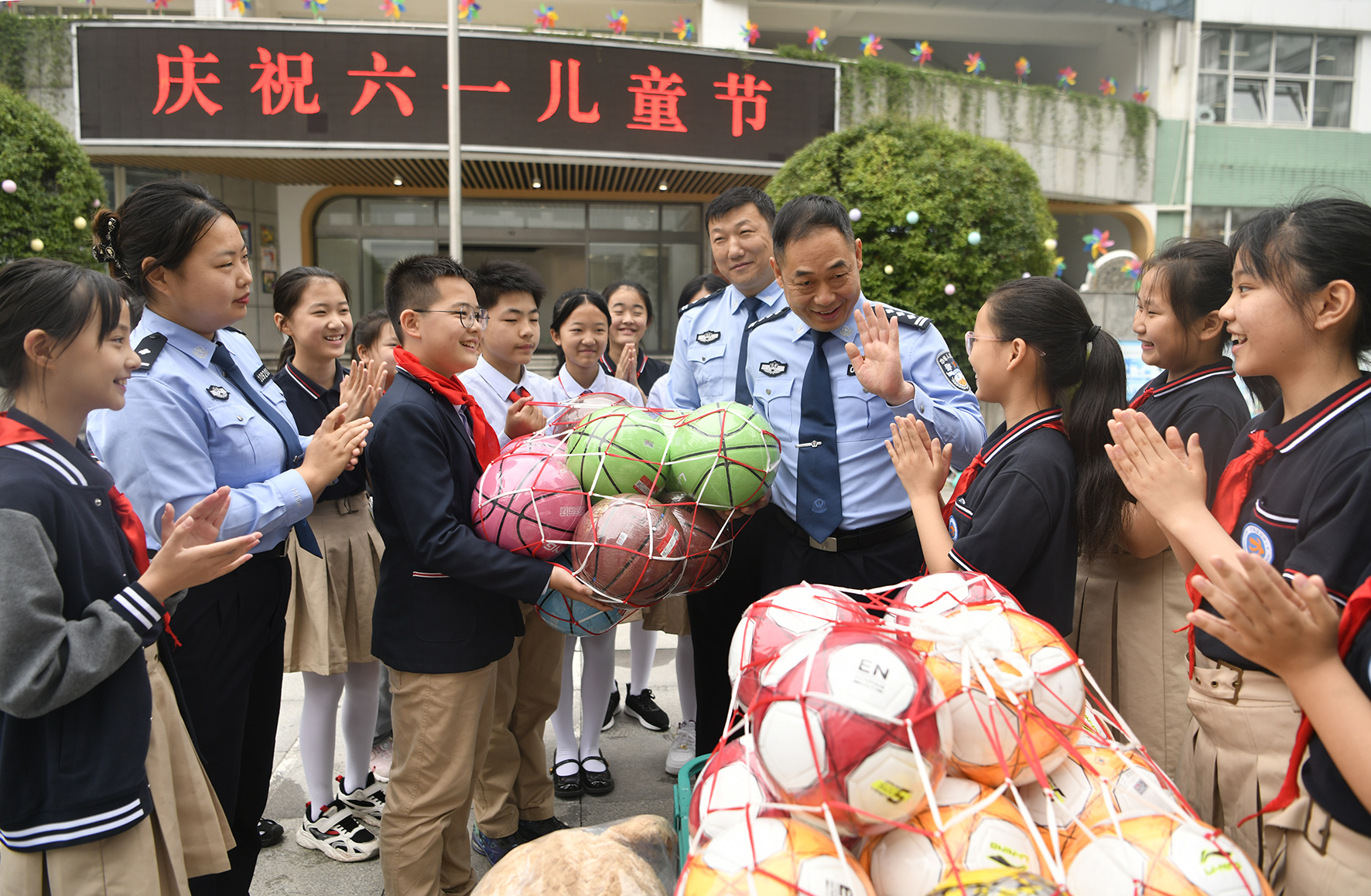 5月30日,河南省鄭州市公安局金水分局民警帶著禮物來到轄區(qū)河南省實(shí)驗(yàn)小學(xué),與同學(xué)們一起歡慶“六一”。