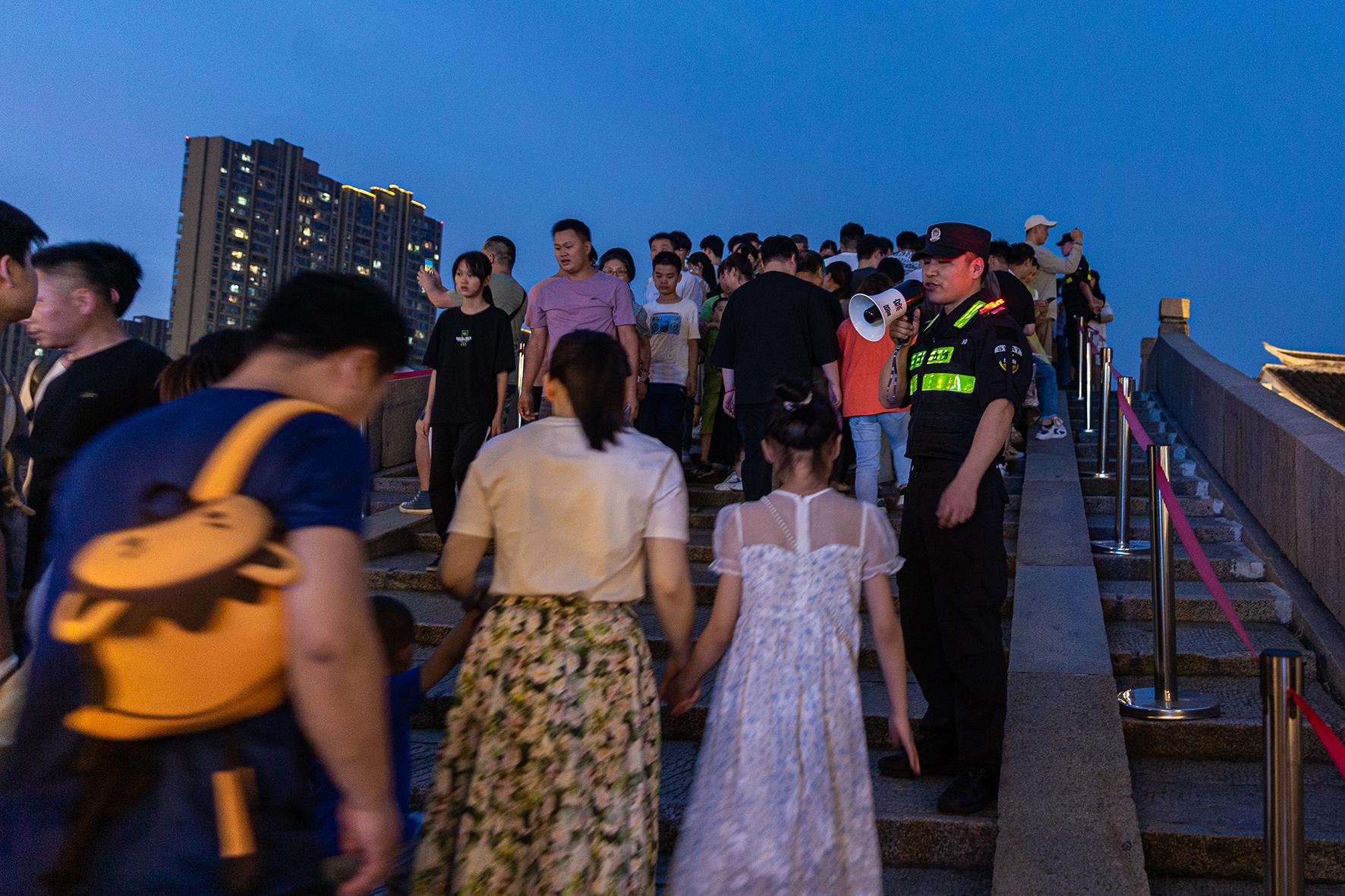 6月22日,安徽省合肥市天鵝湖舉行龍舟賽,現(xiàn)場執(zhí)勤民警拿著喇叭不時提醒群眾注意安全。