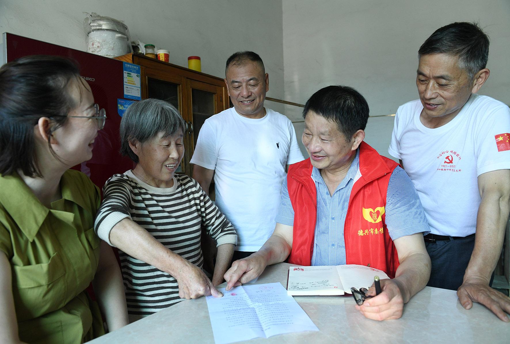 7月4日,江西省德興市??阪?zhèn)退休干部、全國(guó)模范人民調(diào)解員應(yīng)火根在??诖宄晒φ{(diào)解一起鄰里房屋地基糾紛,雙方握手言和并簽訂和解協(xié)議。