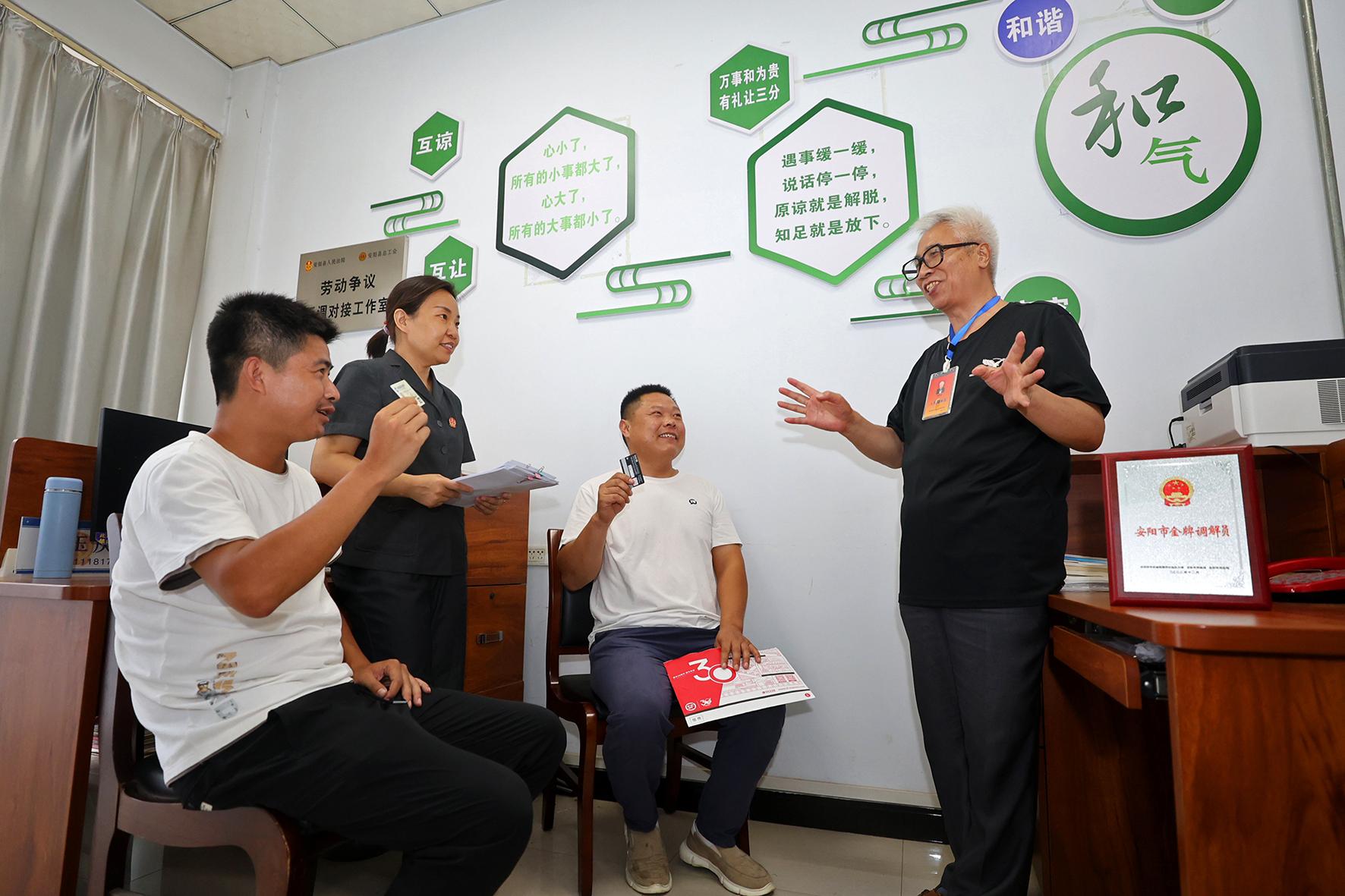 7月11日,河南省安陽縣人民法院訴訟服務(wù)中心人民調(diào)解員通過電話、微信等線上辦案模式,在訴前快速調(diào)解一起勞務(wù)合同糾紛案,兩名當(dāng)事人領(lǐng)取工資款后喜笑顏開。