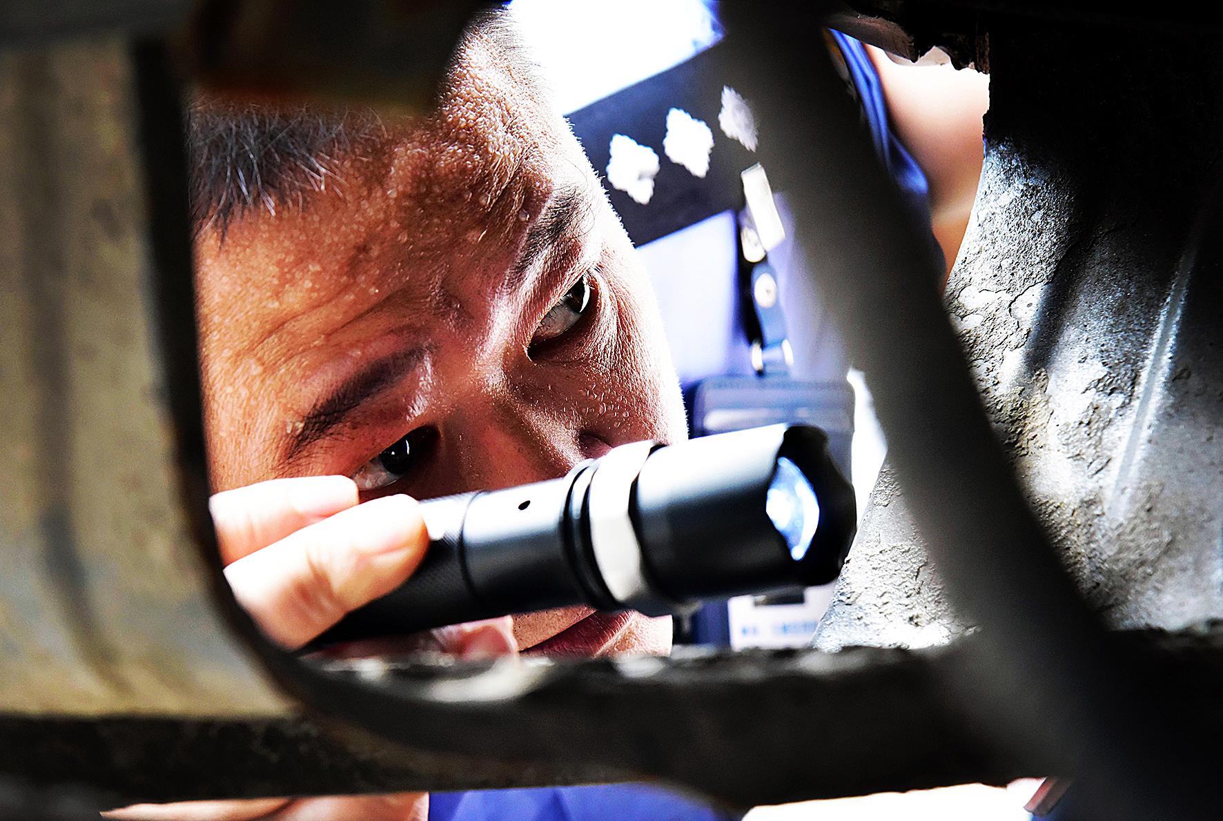 7月12日,氣溫高達40攝氏度。安徽省當涂縣公安局交管大隊車輛管理所民輔警對新入戶的車輛進行認真查驗。