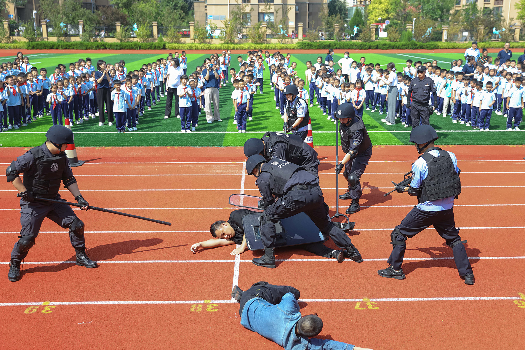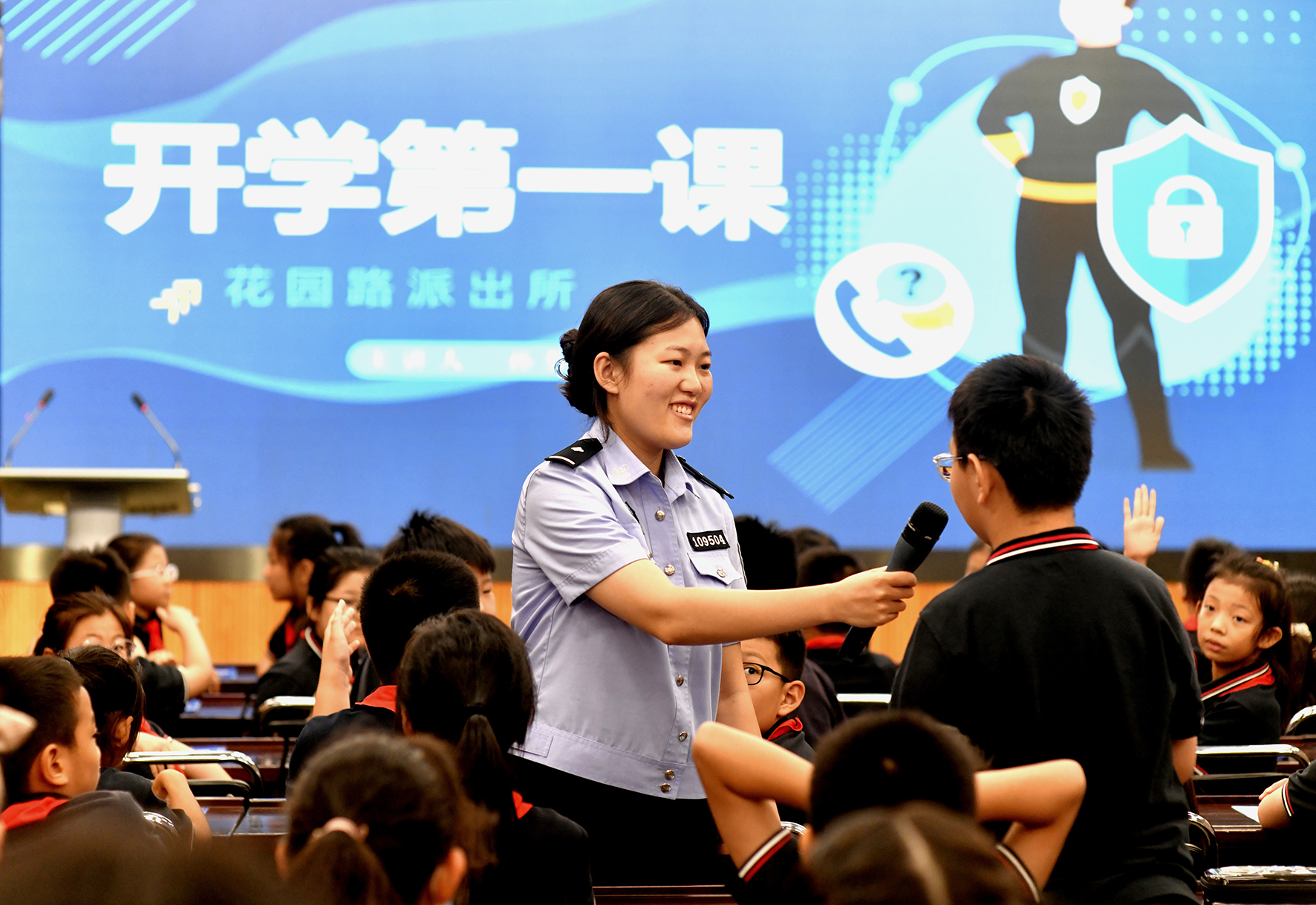 8月30日,河南省鄭州市公安局金水分局巡特警與花園路派出所的民輔警為轄區(qū)學(xué)校師生開展上好“開學(xué)第一課”活動。