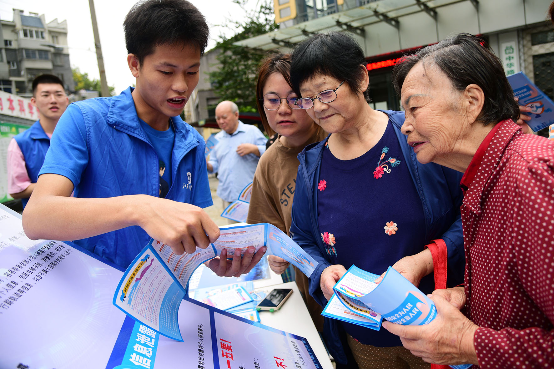 9月16日,在江蘇省鎮(zhèn)江市迎江路中心社區(qū),江蘇科技大學志愿者向居民宣講網(wǎng)絡安全與防電信詐騙等知識。