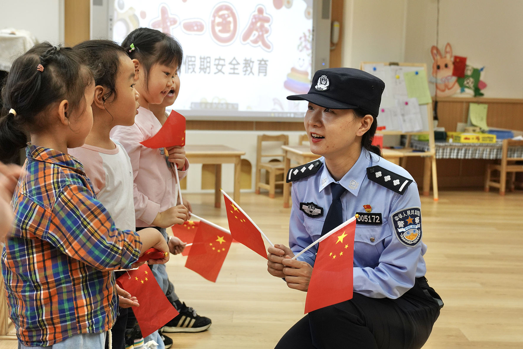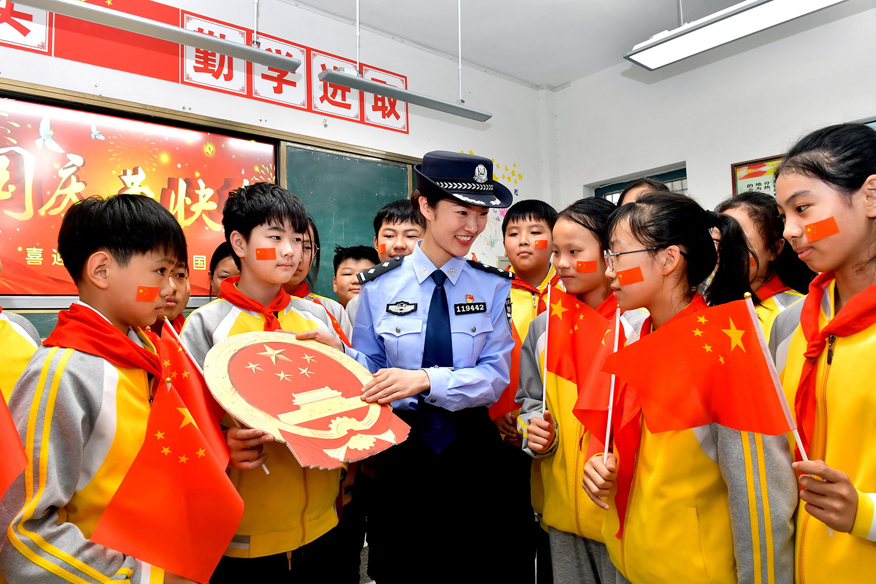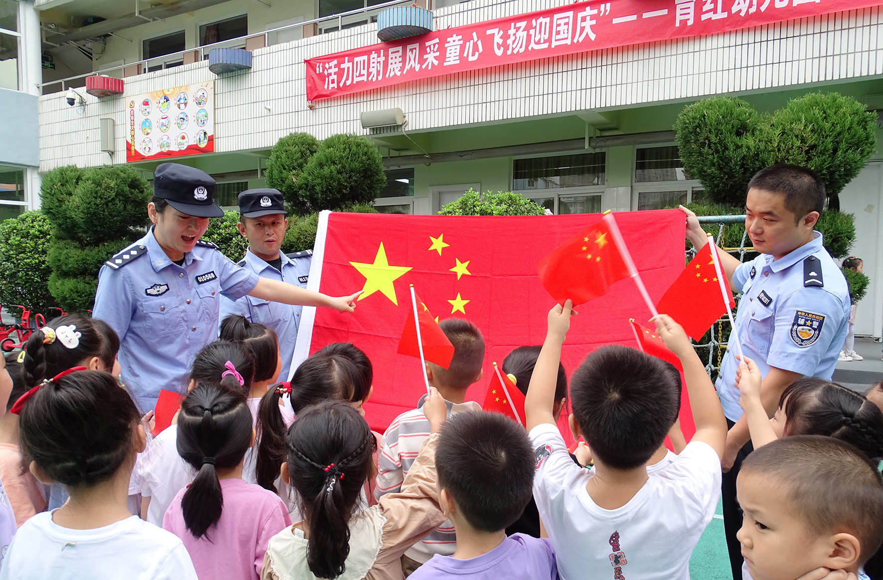 9月27日,安徽省合肥市公安局瑤海分局龍崗派出所民警輔警走進(jìn)轄區(qū)幼兒園開(kāi)展“我為祖國(guó)送祝?!敝黝}教育活動(dòng)。