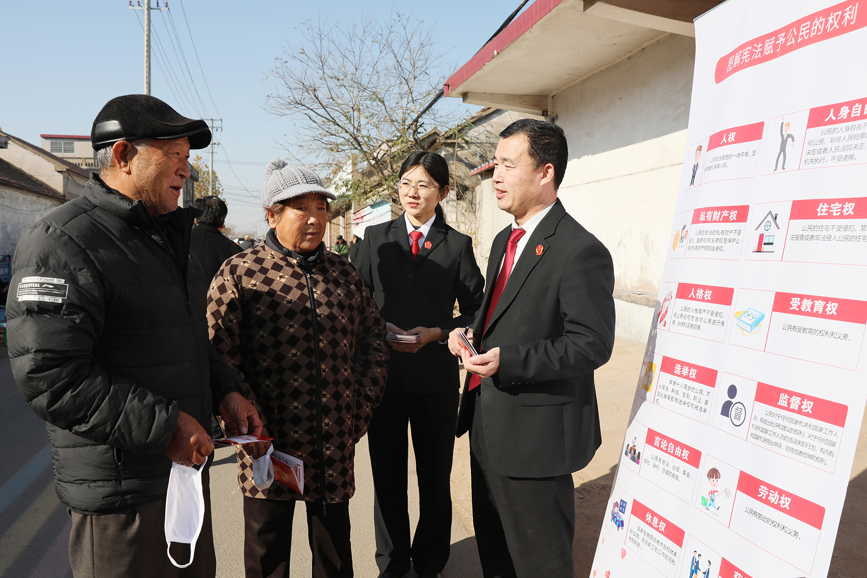 12月1日,山東省臨沭縣人民法院“沭法青穗”普法志愿服務(wù)隊利用趕集日,組織干警向群眾發(fā)放憲法宣傳手冊,宣講憲法知識。