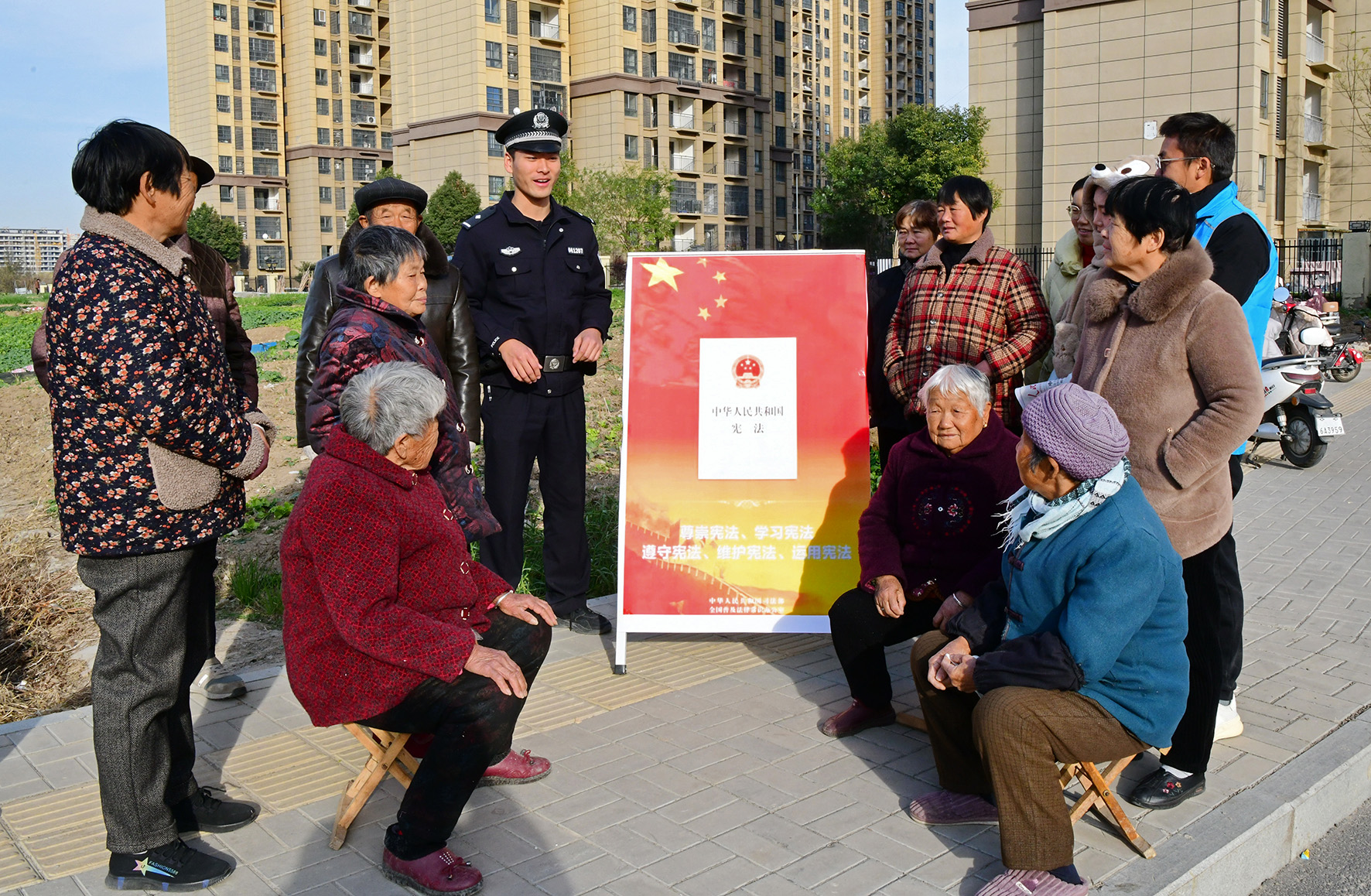 12月1日,安徽省阜南縣鹿城鎮(zhèn)駱寨社區(qū)居民們在聆聽民警講解憲法知識。
