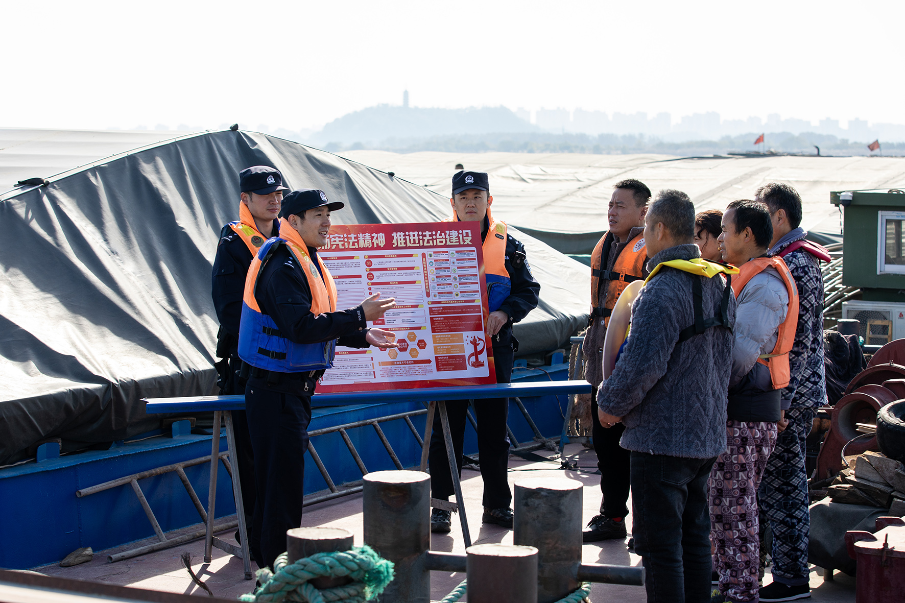 12月1日,長江航運公安局鎮(zhèn)江分局結(jié)合“百萬警進(jìn)千萬家”活動,組織民警前往轄區(qū)長江錨地水域開展“船頭普法課堂”,普及憲法知識。