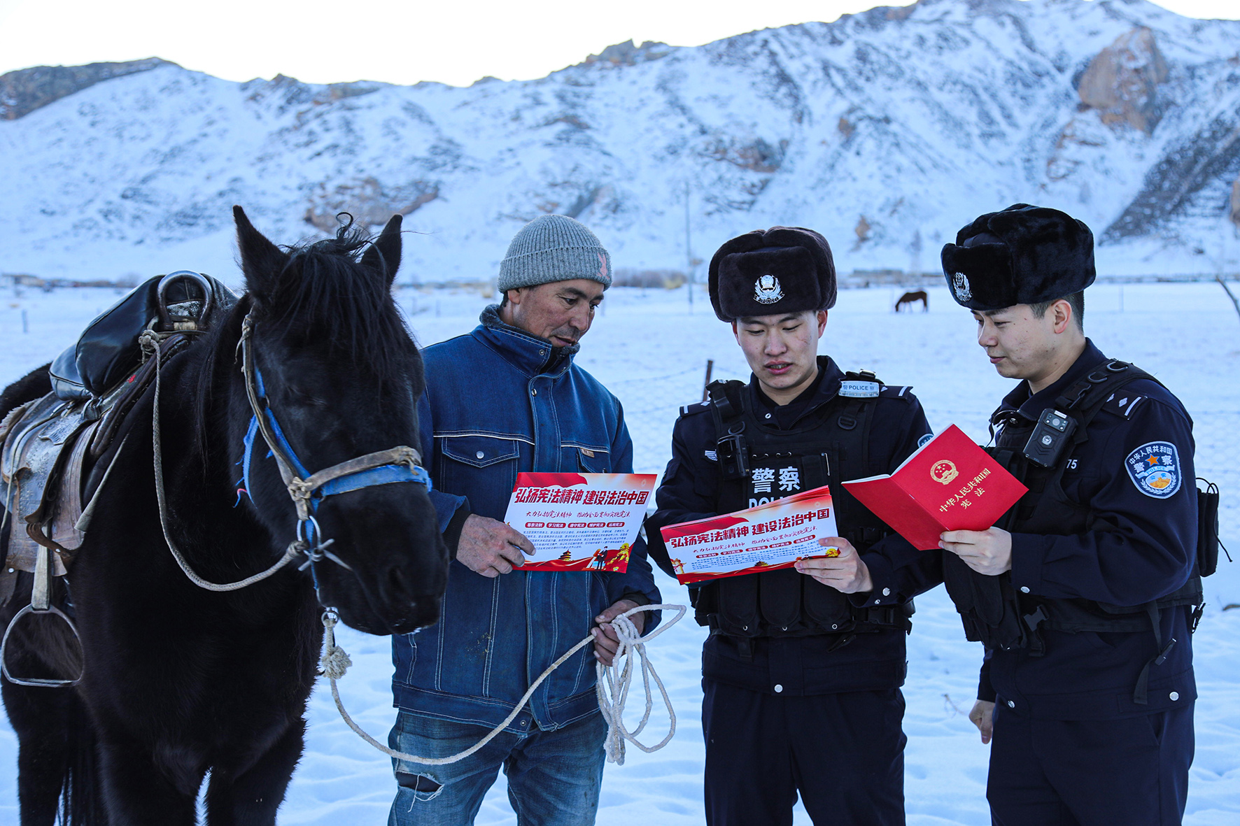 11月30日,新疆出入境邊防檢查總站阿勒泰邊境管理支隊阿熱勒邊境派出所民警深入邊境轄區(qū)開展“國家憲法日”宣傳活動。