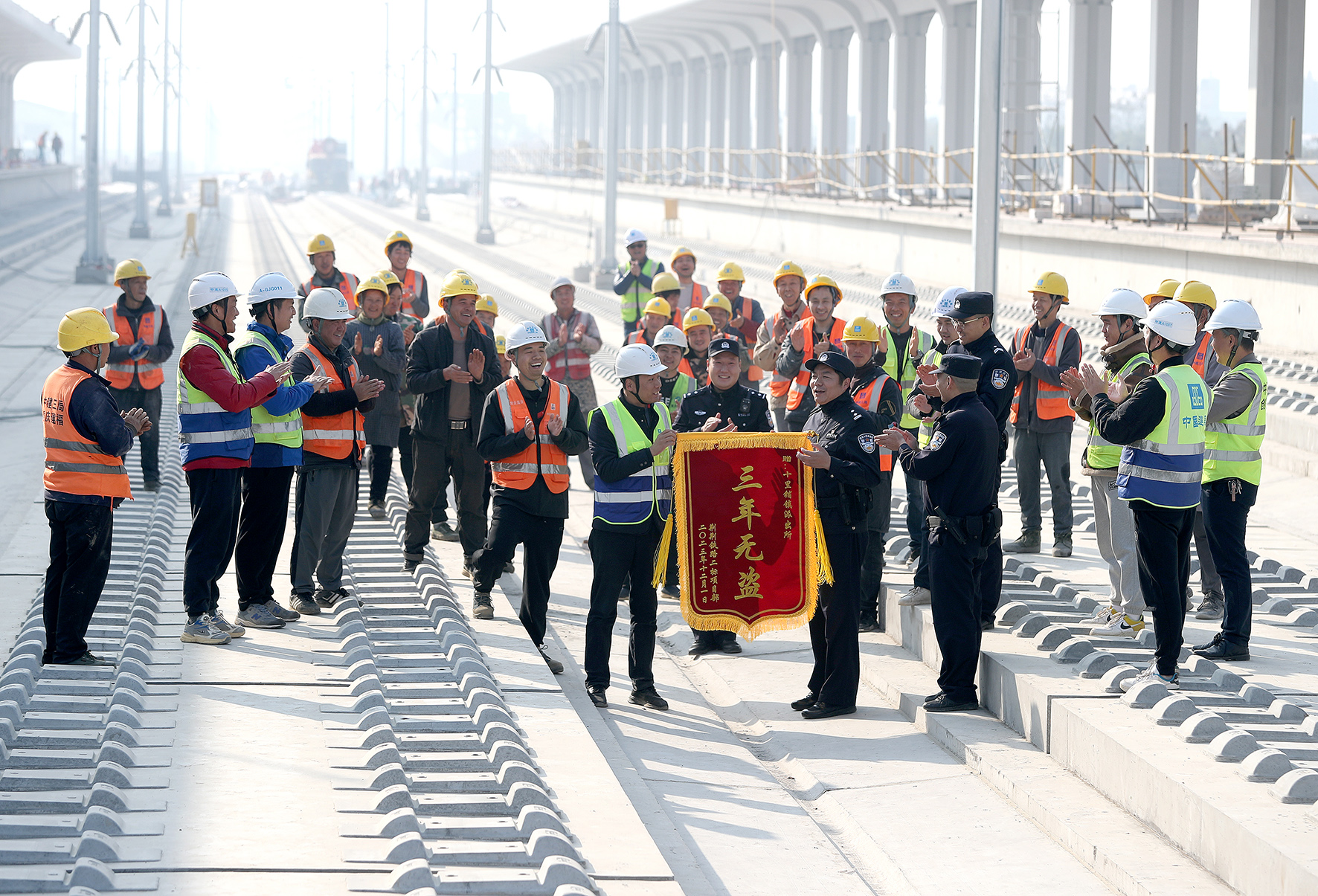 12月5日,在湖北荊荊高鐵沙洋縣十里鋪段建設(shè)工地,項(xiàng)目負(fù)責(zé)人率員工向湖北省沙洋縣公安局十里鋪派出所民警送上一面印有“三年無盜”的錦旗。