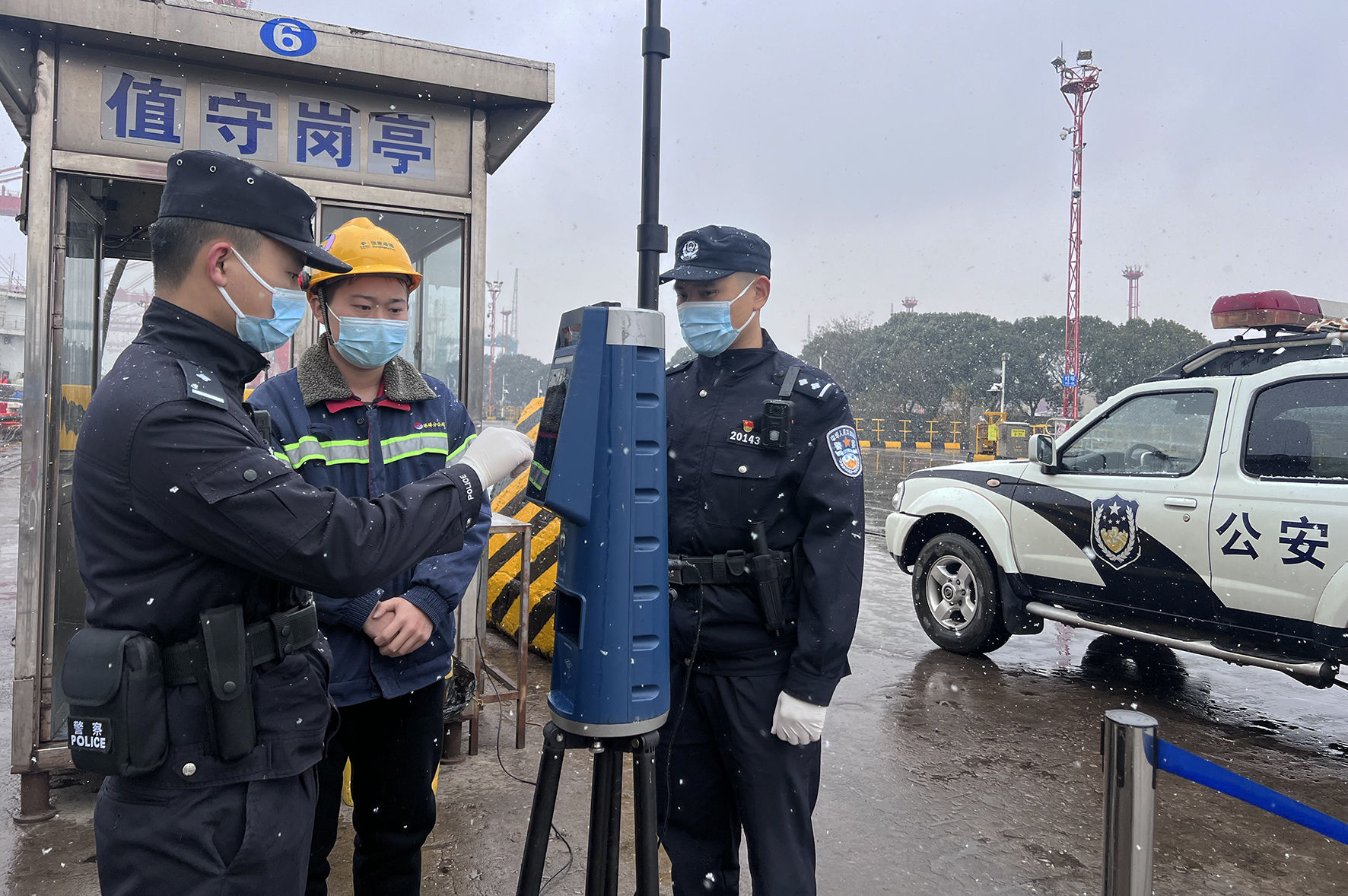 12月18日,江蘇張家港出入境邊防檢查站民警在港務(wù)局碼頭冒雪執(zhí)勤,全力保障口岸安全和通關(guān)順暢。