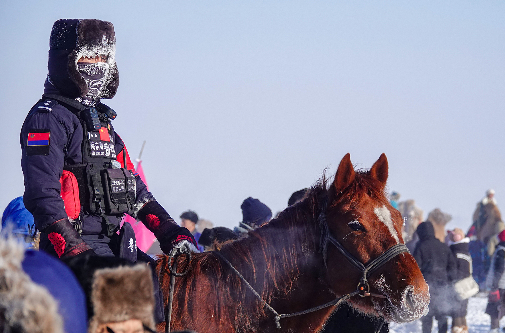 12月17日,內(nèi)蒙古自治區(qū)呼倫貝爾市陳巴爾虎旗公安局海東青騎警隊(duì)員在第二十屆冰雪那達(dá)慕大會(huì)開幕式現(xiàn)場(chǎng)執(zhí)勤。