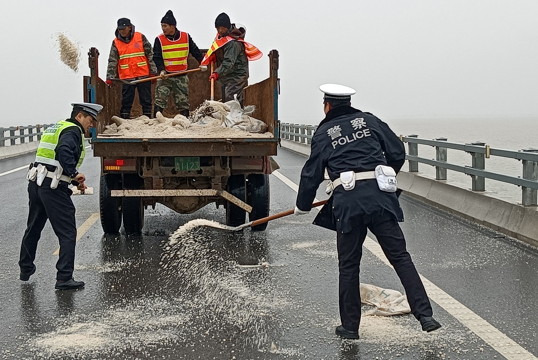 12月18日,安徽省宿松縣全長(zhǎng)7832米的黃湖大橋橋面結(jié)冰,宿松縣公安局交警大隊(duì)和交通部門立即組織人員在結(jié)冰路段撒鹽融冰,確保省道暢通安全。