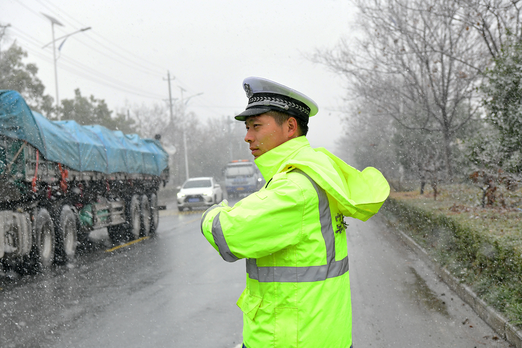 12月18日,安徽省含山縣境內(nèi)普降大雪。含山縣公安局全警動(dòng)員強(qiáng)化惡劣天氣下的道路管控、巡查、疏導(dǎo)等措施,確保道路安全暢通和群眾出行安全。