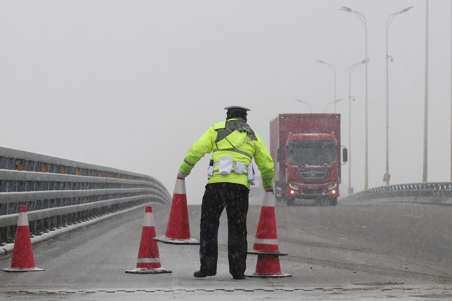 12月16日,安徽省巢湖市公安局交警大隊(duì)民警在巢湖大橋撒鹽除冰時(shí)因路面濕滑不慎摔倒在地。
