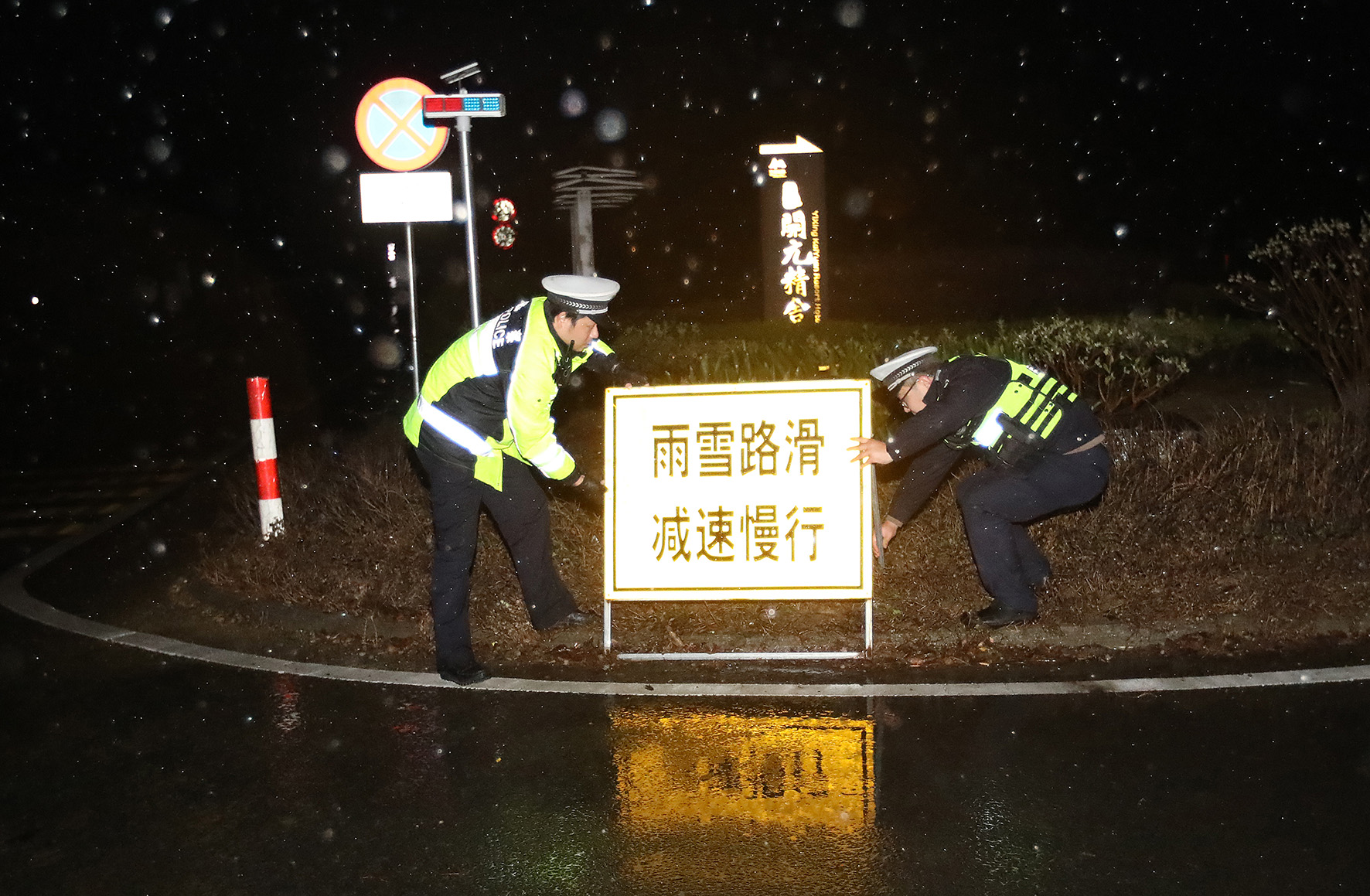 12月15日晚,江蘇省宜興市公安局交警大隊(duì)陽(yáng)羨生態(tài)旅游度假區(qū)中隊(duì)民輔警在宜南山區(qū)易積雪、易發(fā)生事故路段設(shè)置警示標(biāo)牌,提醒過(guò)往車輛減速慢行。
