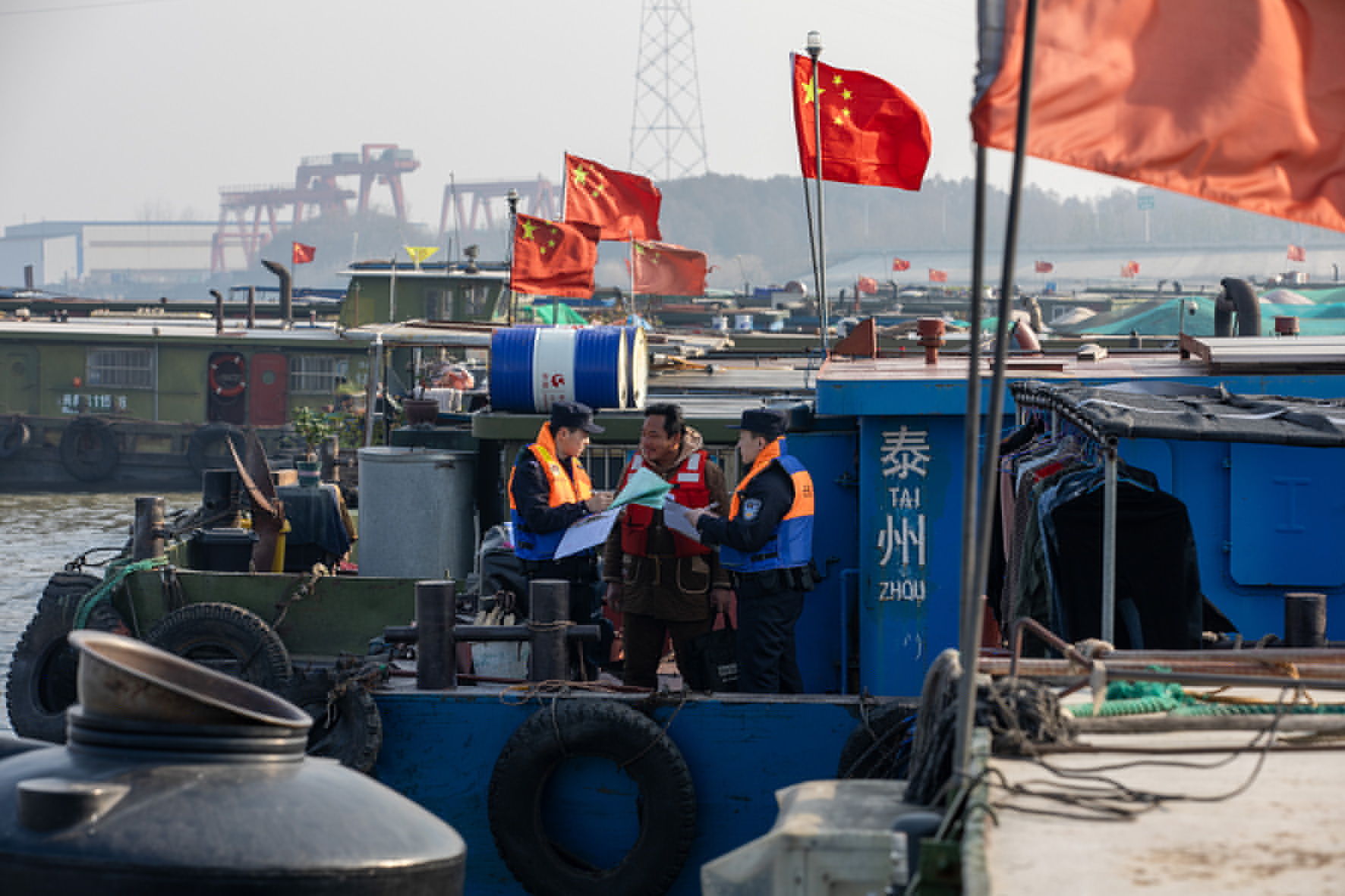 12月28日,長江航運(yùn)公安局鎮(zhèn)江分局組織警力前往轄區(qū)錨地、閘口、水上服務(wù)區(qū)等重點(diǎn)水域開展送安全到船頭活動(dòng),與船民共同迎接新年的到來。