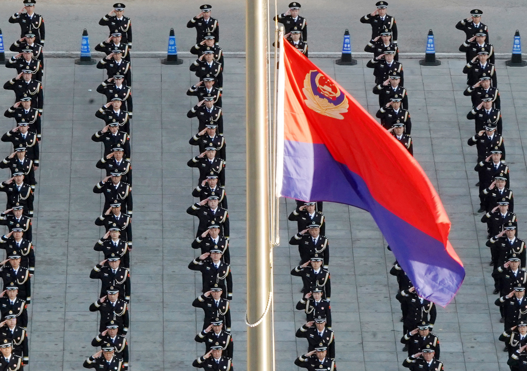 1月10日,山東省煙臺(tái)市公安局舉行升警旗儀式慶祝第四個(gè)中國(guó)人民警察節(jié),民警身著禮服向警旗敬禮,并重溫入警誓詞。