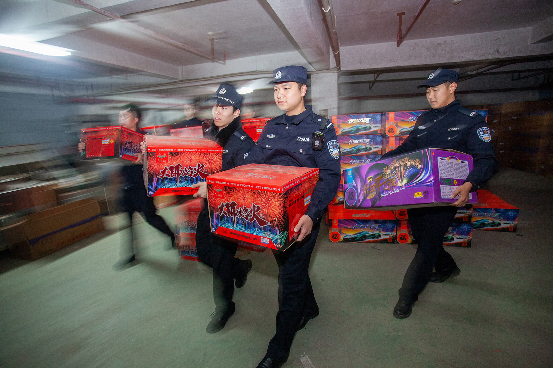 圖為2月2日,民警們對(duì)查獲的一個(gè)非法儲(chǔ)存煙花爆竹倉庫進(jìn)行清點(diǎn)和轉(zhuǎn)移。