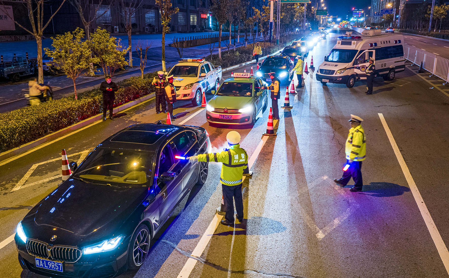 2月16日晚,上海市公安局嘉定分局交警支隊朱橋檢查站民輔警在G15沈海高速朱橋段駐守觀測、疏導(dǎo)返程入滬車流。