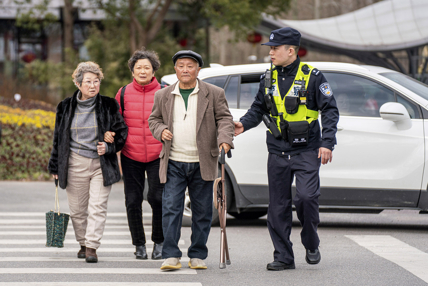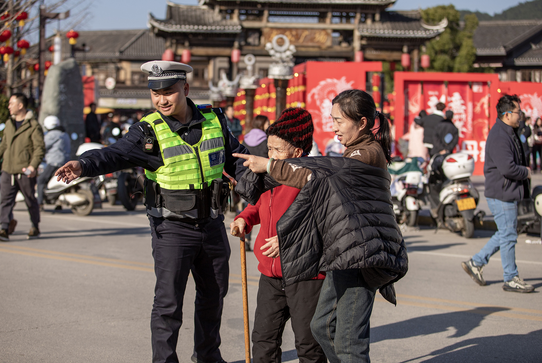 2月16日,上海市公安局崇明分局建設(shè)派出所民警在東平國家森林公園門口護(hù)送行動不便的老人過馬路。