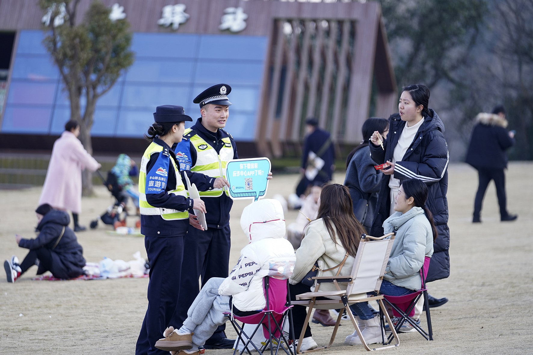 2月11日,浙江省舟山市公安局普陀區(qū)分局東港派出所民警在景點開展安全巡查、反詐宣傳及服務(wù)游客工作,守護(hù)景點平安。