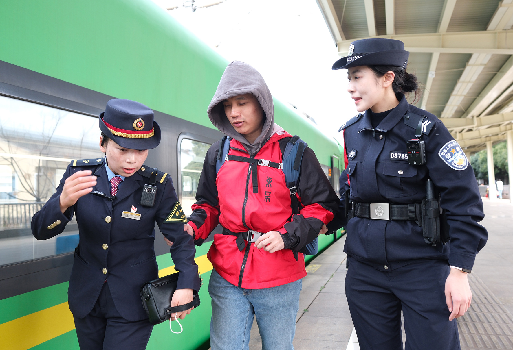 2月17日,杭州鐵路公安處乘警和列車工作人員在站臺上幫助一名盲人旅客乘車。